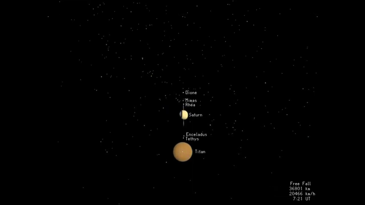 Потом идёт приближение к Титану, у которого заметен жёлто-фиолетовый ободок (так говорят наблюдения с Земли в телескоп). Вне всякого сомнения, это та же компьютерная графика.