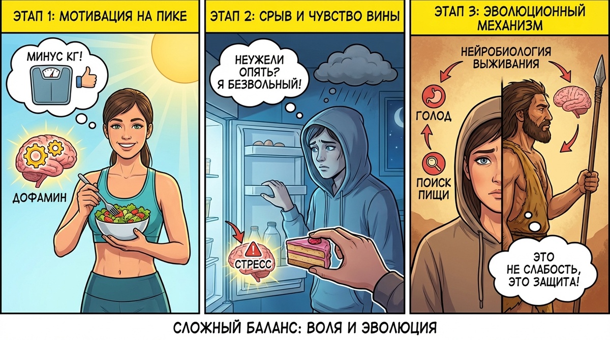 Но что если дело вообще не в силе воли? Что если за каждым «срывом» стоит не слабость характера, а мощнейший нейробиологический механизм, отточенный за тысячи лет эволюции?