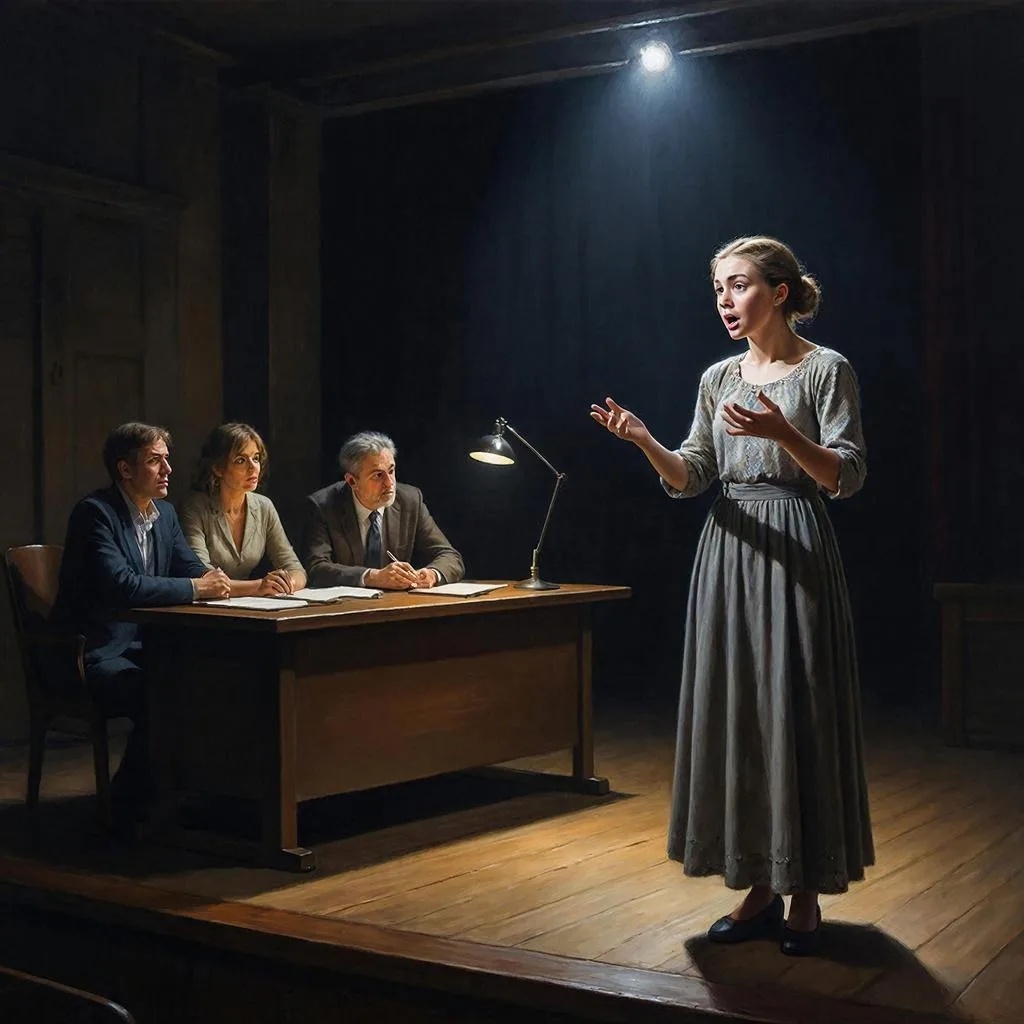 Помещение напоминало заброшенный аквариум — без воды, но с остаточным запахом затхлости, пыли и пожелтевших страниц. Сентябрьский свет, резкий и косой, рассекал пространство на контрастные зоны: яркую — с массивным столом, за которым восседала Комиссия, и сумрачную — у стены, где замерла я.