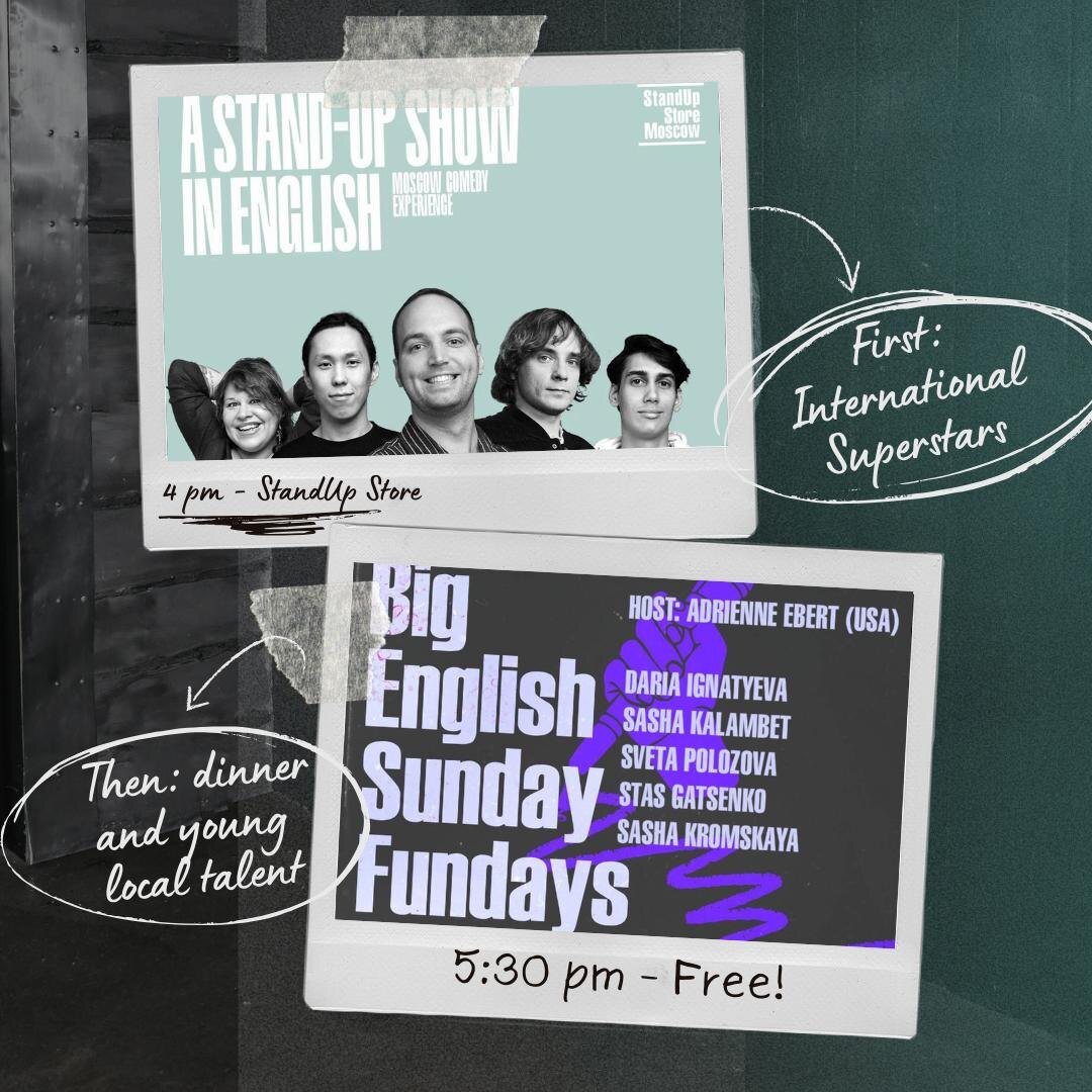 ! First, come over to our monthly Moscow Comedy Experience at StandUp Store to see some famous faces, like Vasily Medvedev... 🕓Time: 16:00 🗺Address: Petrovka 21c1 🎫Entrance: 1,150 rub 🔗Buy tickets here Then take a quick jog around the corner to Stand Up Club on Trubnaya for dinner 🍔and drinks ☕️ at Big English Sunday Fundays, where you'll see some rising talent including Daria, Sveta, and Sasha 🕠Time: 17:30 🗺️Address: Rozhdestvensky Blvd, 10/7 С1 🎟️Entrance: donations welcome + mandatory purchase of any food 🥗 or drink🍸 🔗Click to reserve seats here!