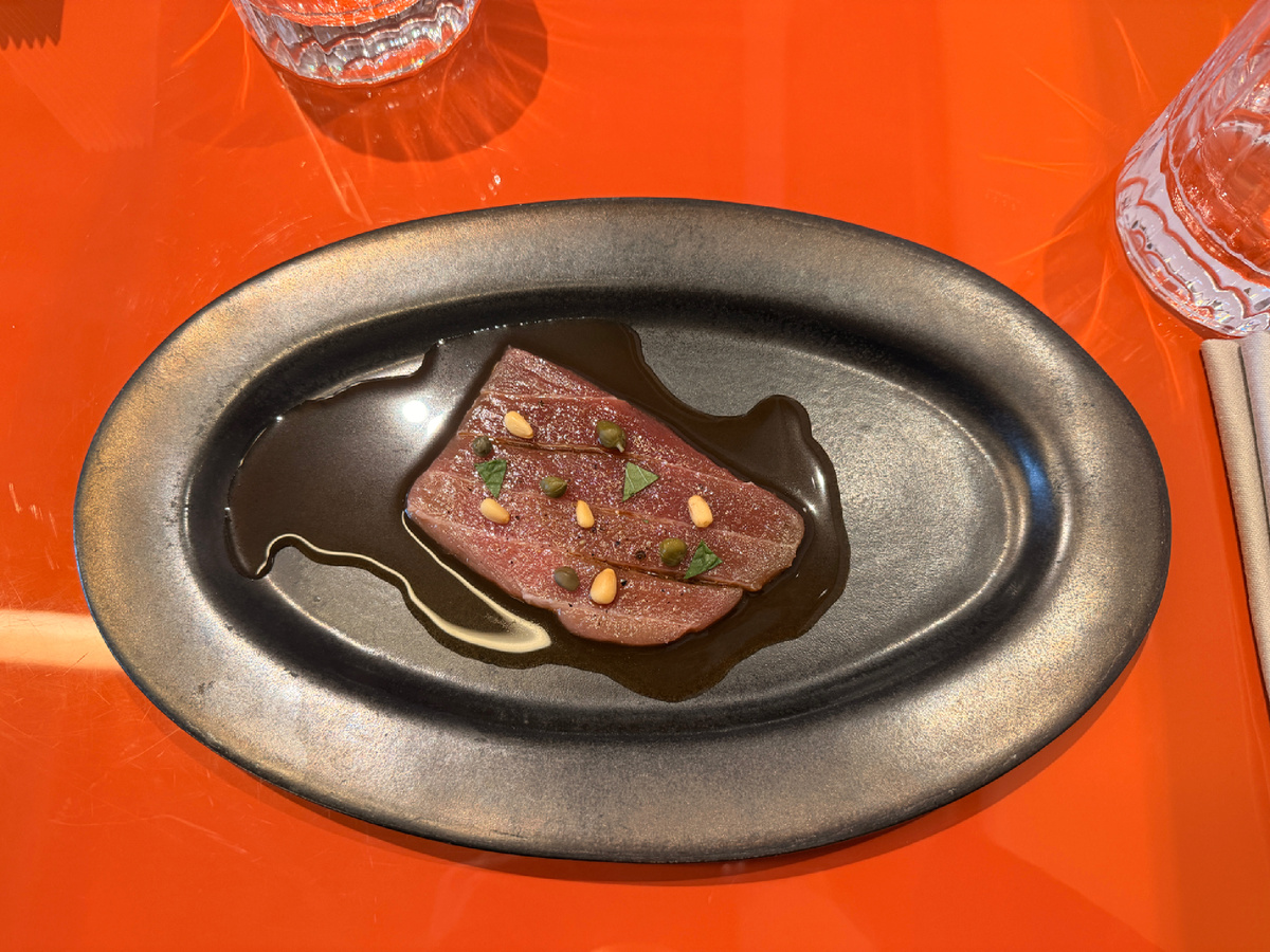 - Тоннато вителло с японским тунцом блюфин, кедровыми орешками и хуакатай: Искусный обман, где нежная говядина уступает место японскому тунцу, купающемуся в бульоне. Это блюдо – иллюзия, мастерски сотканная из привычного и неожиданного, заставляющая взглянуть на классику под новым углом.