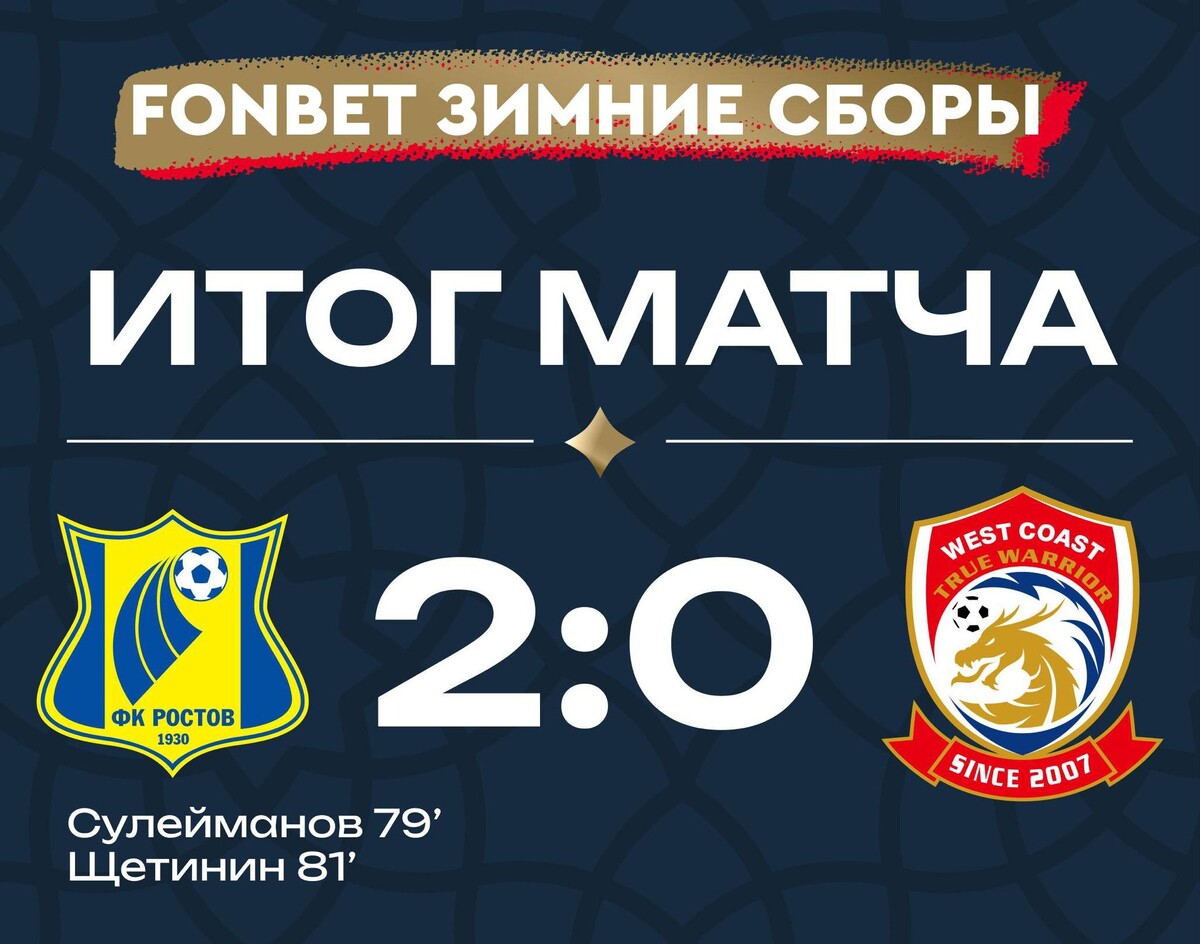 На зимних сборах в Абу-Даби (ОАЭ) ростовчане пока выступают без поражений. Напомним о результатах предыдущих игр. В первой встрече 17 января наши разгромили китайцев со счётом 3:0. 14 января играли с «Локо» - и Николай Комличенко лишил ростовчан победы. А 1 февраля ростовчане не смогли одолеть «Родину». Ну, а 4 февраля ростовчане разгромили ереванский клуб на зимних сборах Сегодня наши играли с сильным китайским клубом. Футбольный клуб «Циндао» в настоящее время выступает в Суперлиге Китая по футболу. Сегодня ростовчане играли с этим клубом. В первом тайме команды присматривались друг к другу. На перерыв ушли по нулям. А потом наши не дали шансов соперникам. На 79-й минуте забивает Сулейманов, а через две минуты Щетинин удваивает счёт. Итог встречи - 2:0. Иллюстрация из тг-канала ФК "Ростов"
