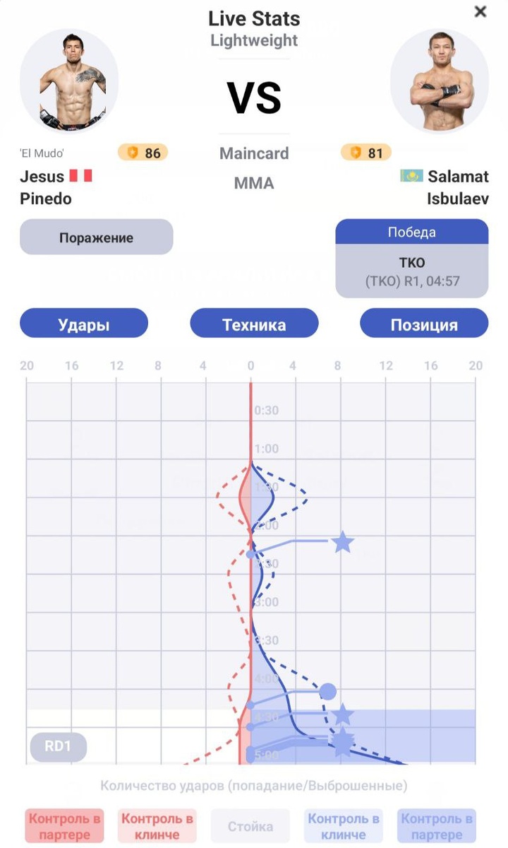 Боец из Казахстана провел бой с Хесусом Пинедо в рамках турнира #PFLDubai. Исбулаев начал очень осторожно, старался нащупать свою дистанцию и пристреляться. Перуанец же постоянно отступал. Ближе к концу раунда Исбулаев все же смог сблизиться и оформить тейкдаун, после чего нокаутировал своего соперника в партере, доведя личный рекорд в профи до круглой цифры – 10:0. Предлагаем изучить динамику их боя от алгоритма Stats Fight.