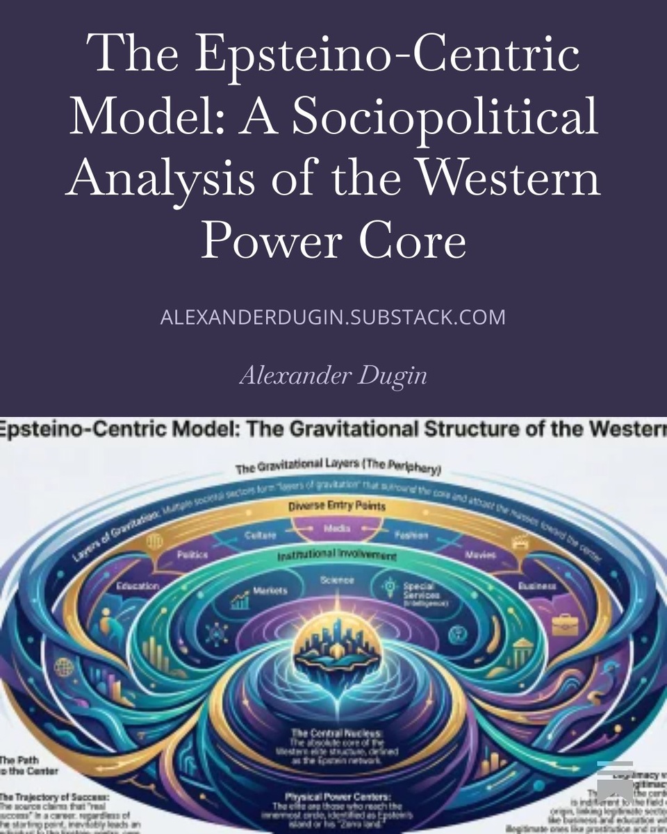 🔎🌐 The Epsteino-Centric Model: A Sociopolitical Analysis of the Western Power Core In this article, Alexander Dugin interprets Western power as a gravitational system organized around a hidden nucleus, toward which all elite trajectories inevitably converge. READ HIS FULL BREAKDOWN HERE https://alexanderdugin.substack.com/p/the-epsteino-centric-model-a-sociopolitical