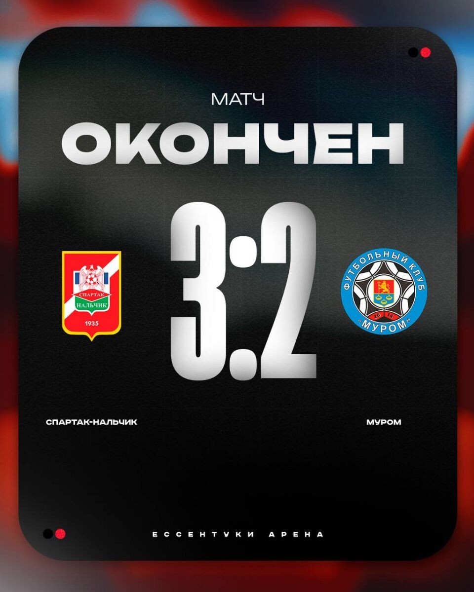 Завершился контрольный матч между футбольными клубами «Спартак-Нальчик» и «Муром» со счетом 3:2 в пользу хозяев поля. Встреча прошла в активной и напряженной борьбе, где каждая из команд демонстрировала нацеленность на результат. Соперник оказывал серьезное давление, однако футболисты «Мурома» предпринимали активные попытки отстоять свои позиции и организовать ответные действия. Ключевым моментом игры стало назначение пенальти в ворота гостей в пользу «Спартака-Нальчик». Особо стоит отметить результативную игру футболиста, находящегося на просмотре в ФК «Муром», который оформил дубль, забив оба мяча своей команды и существенно повлияв на ход противостояния. 0+