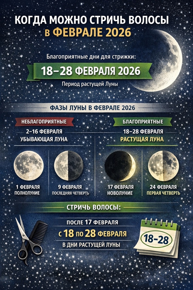 В феврале 2026 подходящие дни для стрижки волос по традиции, основанной на лунном цикле, приходятся на периоды растущей Луны — это 18–28 февраля. Если ориентироваться на ключевые фазы Луны в феврале, то растущая фаза начинается после новолуния 17 февраля и продолжается до конца месяца — с 18 по 28 февраля включительно (после фазы нового месяца до первой четверти и дальше к полной Луне следующего цикла). Растущая Луна — это период между новолунием и первой четвертью/полнолунием, когда наблюдается постепенное увеличение видимой освещённой части спутника. В традиционных лунных календарях именно этот этап часто считают подходящим для стрижек, поскольку он символизирует «рост» и «начало нового цикла». Чтобы ориентироваться в цикле Луны, вот ключевые даты основных фаз: На основе этих фаз: Если вы следуете лунным календарям при планировании стрижки, выбирайте дни после 17 февраля, особенно 18–28 февраля включительно, когда Луна нарастает. Это самый чёткий ориентир на основе астрономического к