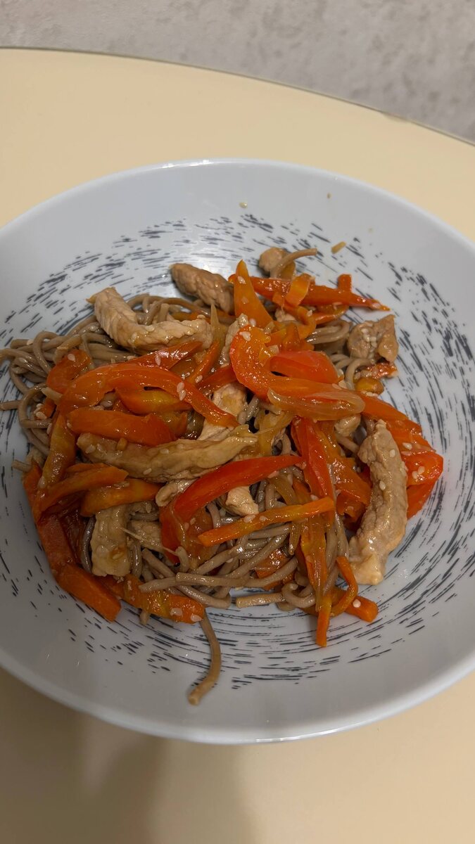 Режем длинными полосочками морковь и лук, мелким кубиком чеснок. Обжариваем сначала морковь, потом добавляем лук и чеснок. Режем тонкими полосками свинину, добавляем к овощам. Как мясо зажарилось вливаем соус терияки и немного воды, убавляем огонь. Как соус загустел добавляем перец (также порезанный тонкими полосками). В конце посыпаем кунжутом. Собу варим по рецепту с упаковки. Затем перемешиваем с овощами и свининой.