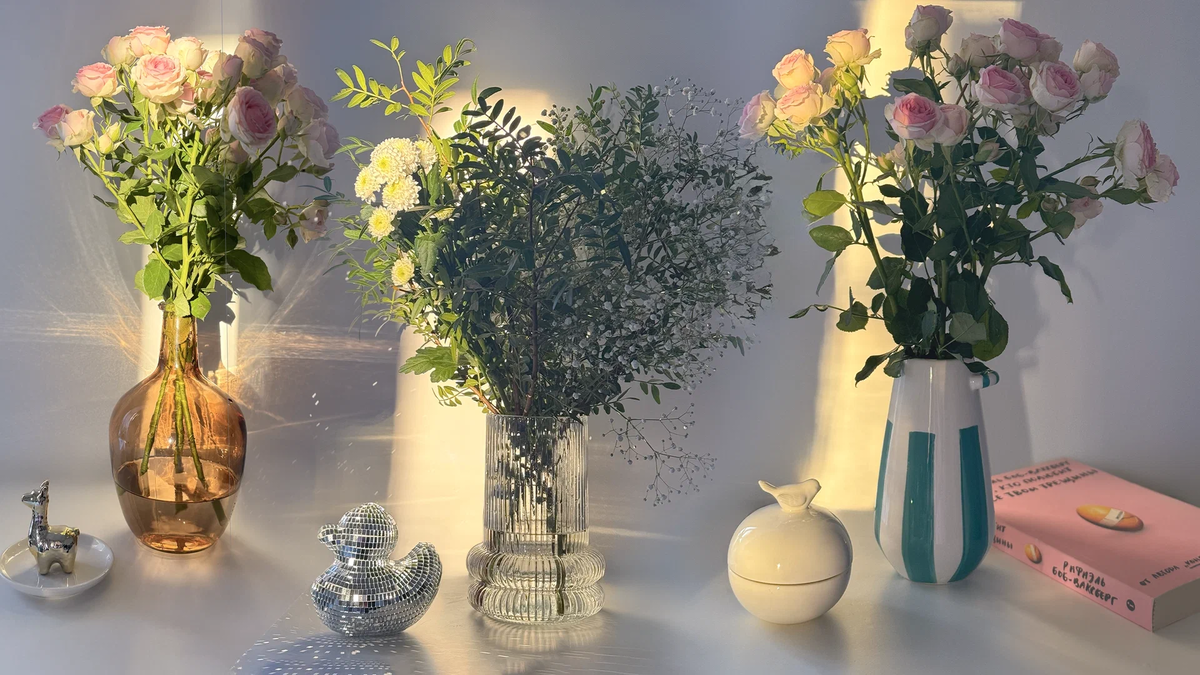 - Форма. Узкое горло — для одинокого цветка. Широкое — для пышных букетов и «я тут немного купила на рынке». Ребристая поверхность — для игры света. Гладкая — для минималистов и тех, кому лень вытирать пыль из бороздок.