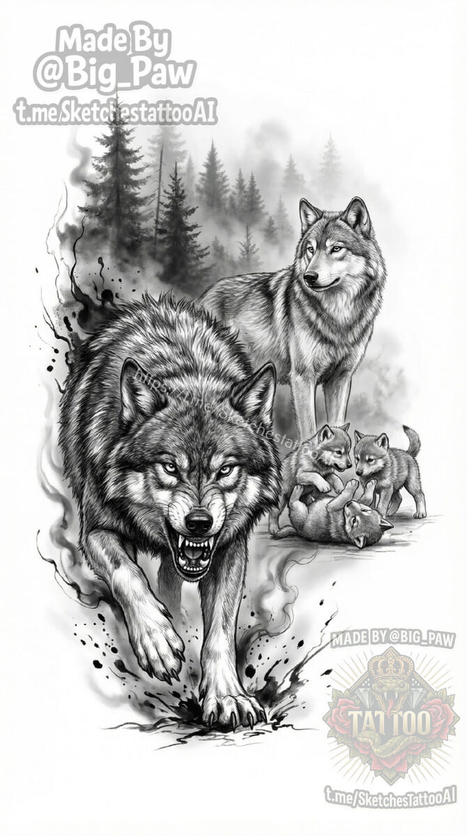 #2911 Подборка по запросу подписчика - Можно пожалуйста сделать что то на подобии такого , ТОЛЬКО ! Нужно чтоб спереди был Волк ,в позе будто готов напасть или готов к нападению а на заднем фоне красивая Волчица и беззаботно играющие волчатки ) заранее большое спасибо 🧠 SYNTX - тут создан эскиз 💎 Информация - все услуги 💀 Эскизы от нейросети 😎 Удалить тату - прайс #волк #природа #животные #эскиз #тату #татуировка