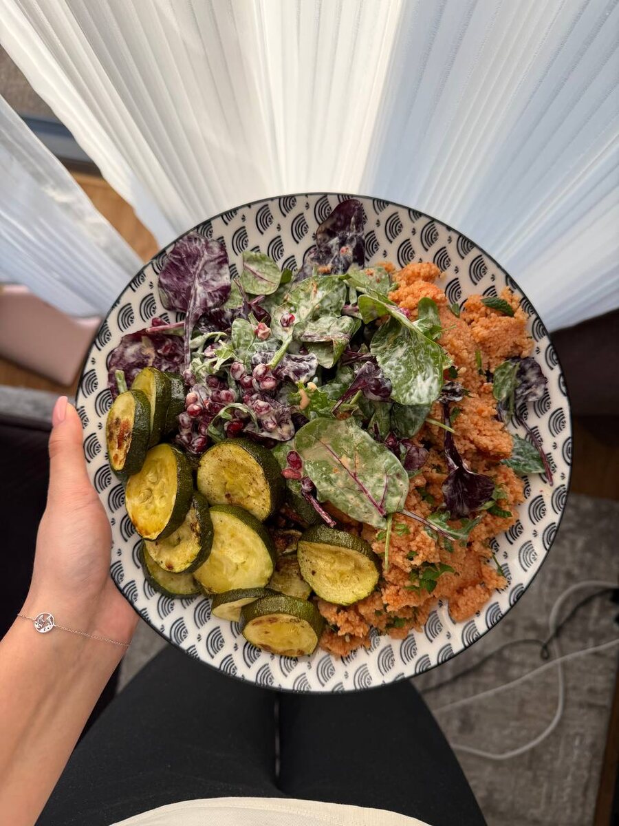 //1. Я вообще не могу есть много с утра. Поэтому завтрак у меня почти всегда лёгкий: йогурт / хлебцы с пол-авокадо или овсянка + кофе. //2. В приоритете простая и быстрая еда. Мы с мужем оба работаем, и в будни стоять у плиты часами — ноу. //3. Сильно спасает доставка рецептов раз в неделю. Здесь — HelloFresh, в РФ — Шефмаркет. Ты выбираешь блюда, тебе привозят ровно нужные продукты + инструкции. Меньше лишних покупок, меньше отходов, понятная калорийность и белки, экономия времени и энергии. А на выходных уже можно готовить что-то «от себя» и с настроением. //4. Я не ограничиваю себя вредностями. Но стараюсь есть немного, а не все сразу. Без чувства вины и без доедания «раз уж начала». //5. Суперфуды: чиа, семечки — либо сразу выбираю рецепты с ними, либо докидываю сама. //6. На обед чаще всего суп, и да, я реально могу сварить его среди рабочего дня. Супы-пюре — любовь, потому что это максимум 30 минут и минимум телодвижений. //7. Майонез и сметану не ем вообще. Соусы — обожаю