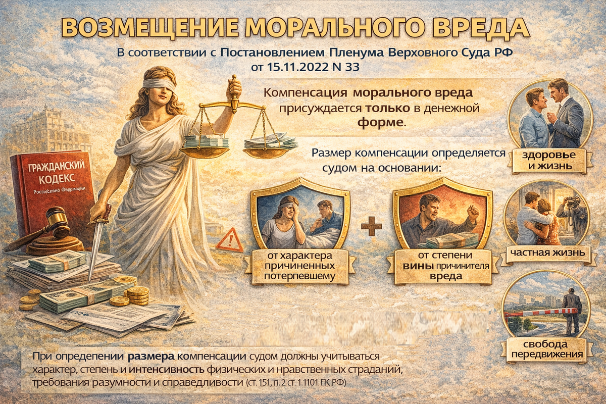В соответствии с п. 1 Постановления Пленума Верховного Суда РФ от 15.11.2022 N 33 "О практике применения судами норм о компенсации морального вреда" (далее - Постановление Пленума ВС РФ N 33) под моральным вредом понимаются нравственные или физические страдания, причиненные действиями (бездействием), посягающими на принадлежащие гражданину от рождения или в силу закона нематериальные блага или нарушающими его личные неимущественные права (например, жизнь, здоровье, достоинство личности, свободу, личную неприкосновенность, неприкосновенность частной жизни, личную и семейную тайну, честь и доброе имя, тайну переписки, телефонных переговоров, почтовых отправлений, телеграфных и иных сообщений, неприкосновенность жилища, свободу передвижения, свободу выбора места пребывания и жительства, право свободно распоряжаться своими способностями к труду, выбирать род деятельности и профессию, право на труд в условиях, отвечающих требованиям безопасности и гигиены, право на уважение родственных и семейных связей, право на охрану здоровья и медицинскую помощь, право на использование своего имени, право на защиту от оскорбления, высказанного при формулировании оценочного мнения, право авторства, право автора на имя, другие личные неимущественные права автора результата интеллектуальной деятельности и др.) либо нарушающими имущественные права гражданина.