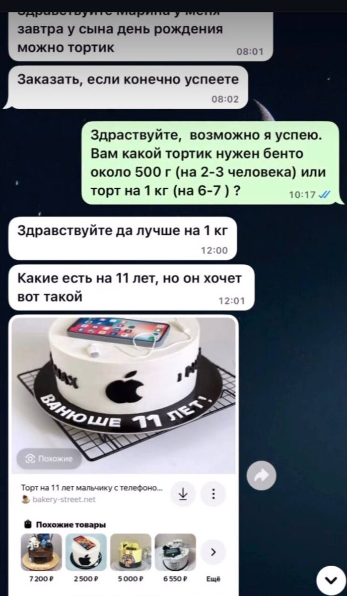 Во время обсуждения даже подозрений не возникло о ее неадекватности, все шло хорошо. Нужен был торт на день рождения сына (11 лет), два дня обсуждали декор, выбрали начинку. Когда торт был готов, отправила фото, чтобы показать результат. Заказчице понравился торт, но забирать его в тот же день отказалась, попросила разрешения забрать на следующий день в обед. Я попросила ее обязательно забрать, так как готовый торт не должен долго стоять.
