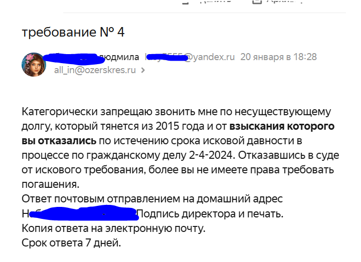 А приставал долго. И дважды про одно и то же на судебный приказ подавал. Апелляция назначена. Покатаемся в Челябинск. Пока не надоело. А потом, после этого суда, который отказал (и по которому теперь апелляция)...... начались звонки робота про те же "долги". И написала я: Конечно, не 7 дней, но ответ пришёл. 2 февраля пришёл. Вот так, капать на мозг ПОСТОЯННО. Сказала же: красным цветом на ватмане на стену бухгалтерии мою фамилию повесьте! На домашний адрес, кстати, не пришло ничего. Опять распечатывать за свой счёт. Чёта подумалось, а не взыскать ли мне моральный вред за неотправку мне письма по почте? По законному требованию потребителя? Написать иск, написать рассмотрение в моё отсутствие. Рублей сто дадут? ха-ха-ха-ха-ха-хаааааааа