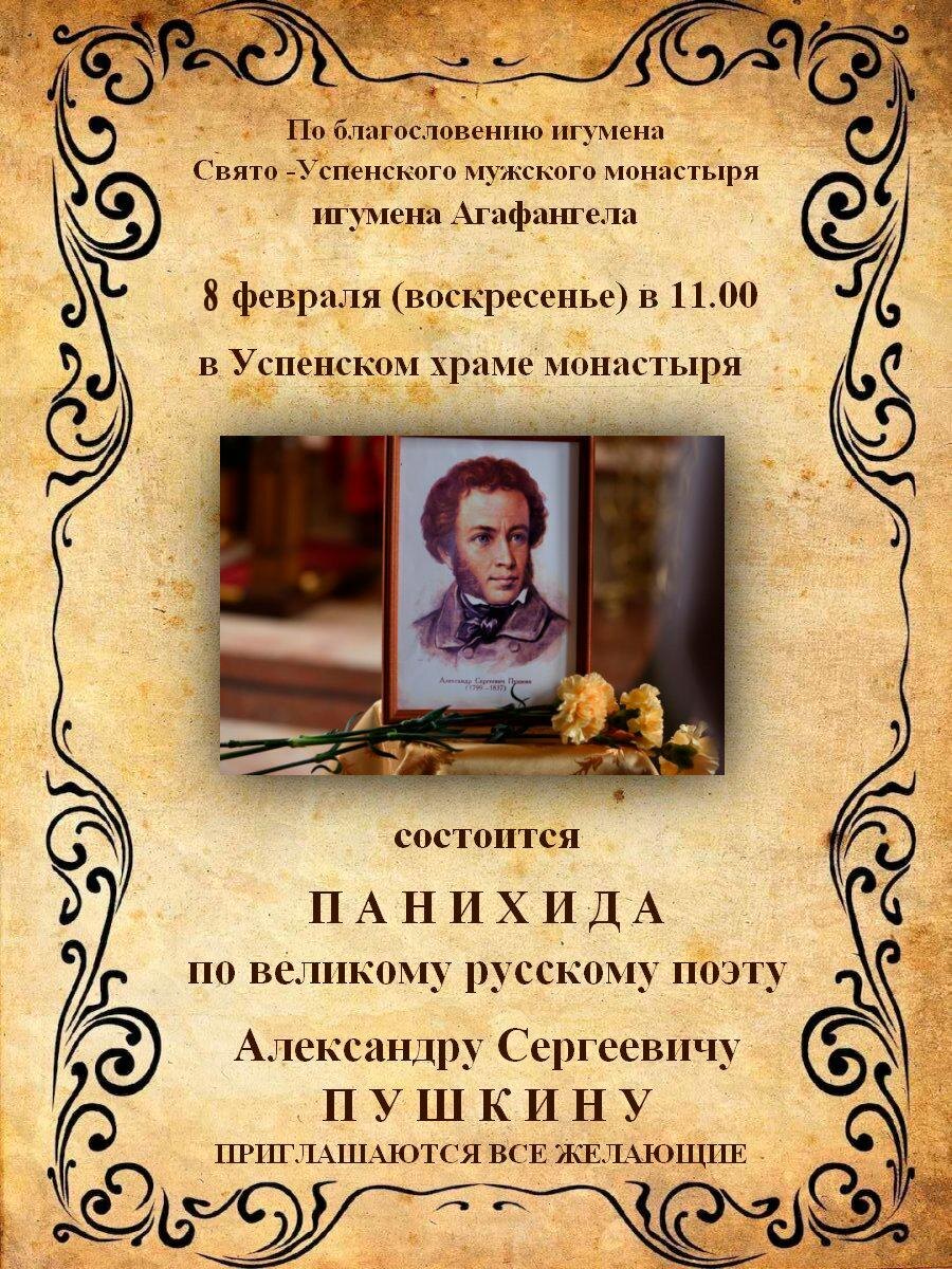 Завтра в нашем монастыре пройдет панихида по Александру Сергеевичу Пушкину.