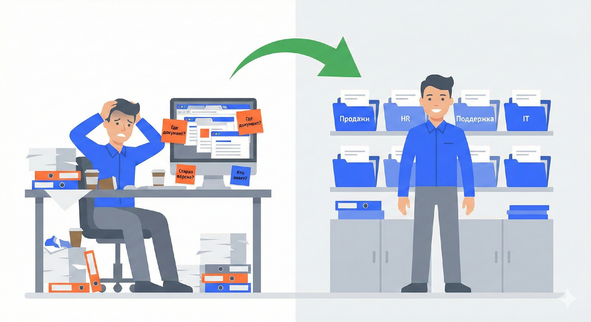 Компания создала базу знаний два года назад. Загрузили 200 документов, регламентов, инструкций. Результат? Сотрудники продолжают задавать одни и те же вопросы.