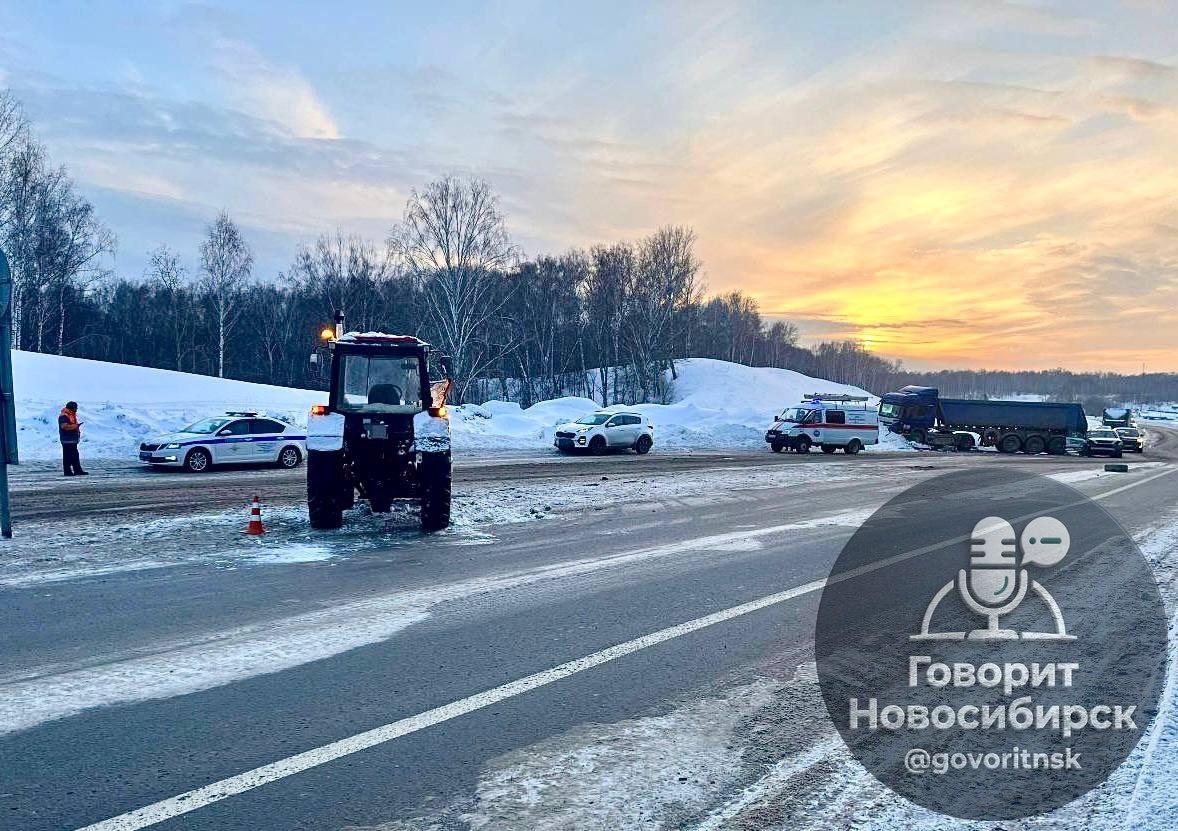 👮 Появились подробности [ДТП на Гусинобродском тракте](https://t.me/teleact54/64557) с участием трактора. В результате пострадали женщина и ребёнок. На 18-м километре автодороги К-19р водитель трактора МТЗ 1975 года рождения, выполняя очистку обочины, при развороте, не уступил дорогу автомобилю Lexus RX под управлением 38-летнего мужчины. После этого Lexus выехал на встречную полосу и столкнулся с грузовиком Scania под управлением 49-летнего водителя, сообщили в пресс-службе Госавтоинспекции по Новосибирской области. В результате аварии серьёзные травмы получили пассажиры Lexus — 39-летняя женщина и 11-летняя девочка 🏥 Говорит Новосибирск