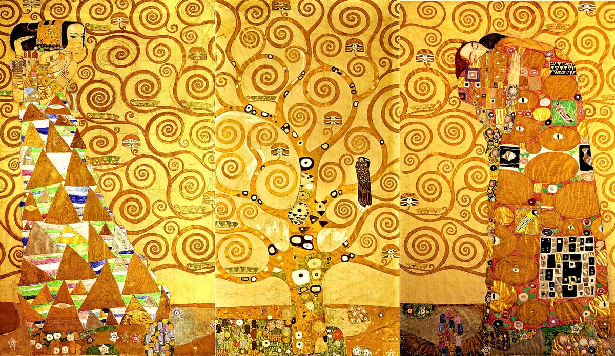 Поздний венский модерн заложил основы дизайна XX века, уделяя внимание комфорту и качеству материалов. В ранний период золотом были написаны лишь элементы, но постепенно оно распространилось на произведения целиком. Так же в его работах много символизма и орнаментов. Климт вдохновлялся византийской мозаикой, египетским искусством и японской гравюрой. Эти образы он воплотил в орнаментах своих картин. В центре внимания в основном женские образы, чувственность, аллегория жизни и смерти.