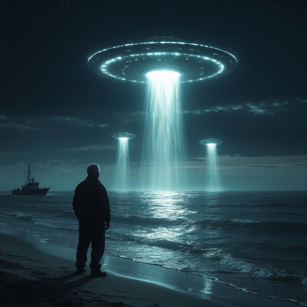 И тут произошло самое странное. Из центра луча, прямо из воды, начали подниматься... фигуры. Не человеческие, не рыбьи — нечто среднее. Они были полупрозрачными, мерцающими, словно состояли из самой воды и света. Три существа плавно поднялись по лучу и исчезли в нижней части аппарата. Луч погас, объект на мгновение замер, а затем резко рванул вверх, оставив после себя лишь легкое свечение в небе, которое медленно рассеялось.