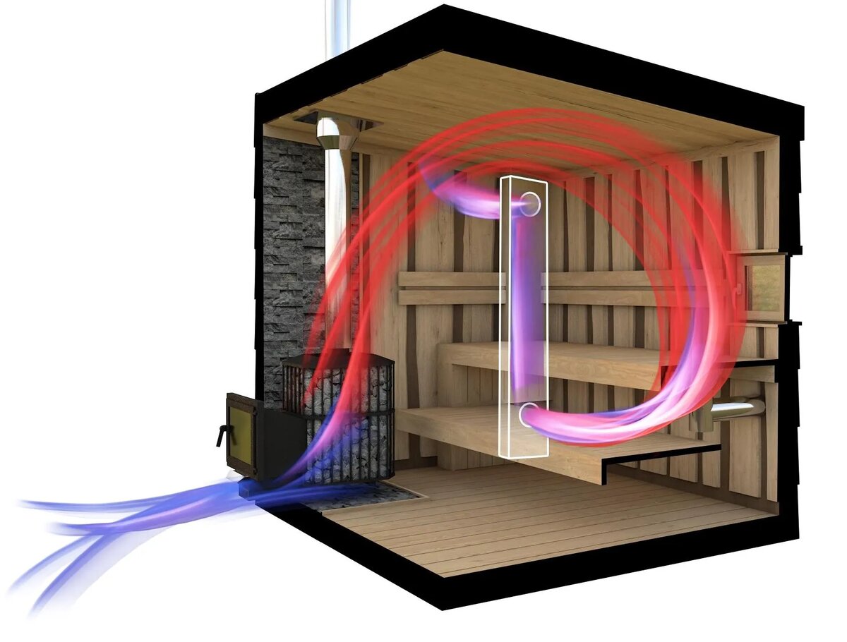 - Эффективность парения. Свежий воздух, попадая в зону печи, нагревается, создавая мощный, но легкий конвекционный поток. Это значит, что жар не застаивается под потолком, а равномерно распределяется по всему объёму, прогревая полки и ноги парильщиков.