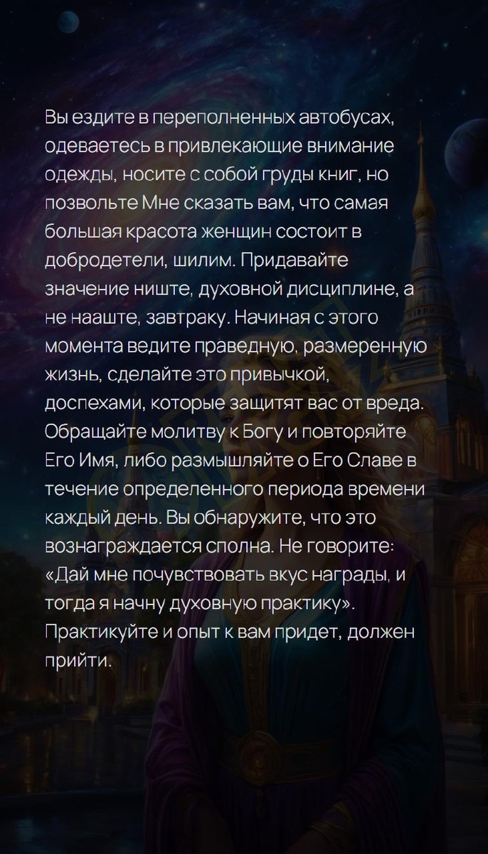 Вы ездите в переполненных автобусах, одеваетесь в привлекающие внимание одежды, носите с собой груды книг, но позвольте Мне сказать вам, что самая большая красота женщин состоит в добродетели, шилим. Придавайте значение ниште, духовной дисциплине, а не нааште, завтраку. Начиная с этого момента ведите праведную, размеренную жизнь, сделайте это привычкой, доспехами, которые защитят вас от вреда. Обращайте молитву к Богу и повторяйте Его Имя, либо размышляйте о Его Славе в течение определенного периода времени каждый день. Вы обнаружите, что это вознаграждается сполна. Не говорите: «Дай мне почувствовать вкус награды, и тогда я начну духовную практику». Практикуйте и опыт к вам придет, должен прийти. Архитектура вашей души | Матрица судьбы T | VK | Pin | YouTub | Dzen #важное #позитив #цель #учусьлюбитьсебя #духовныйрост #верьвсебя #взаимопонимание #энергияжизни #антистресс #7число #7февраля