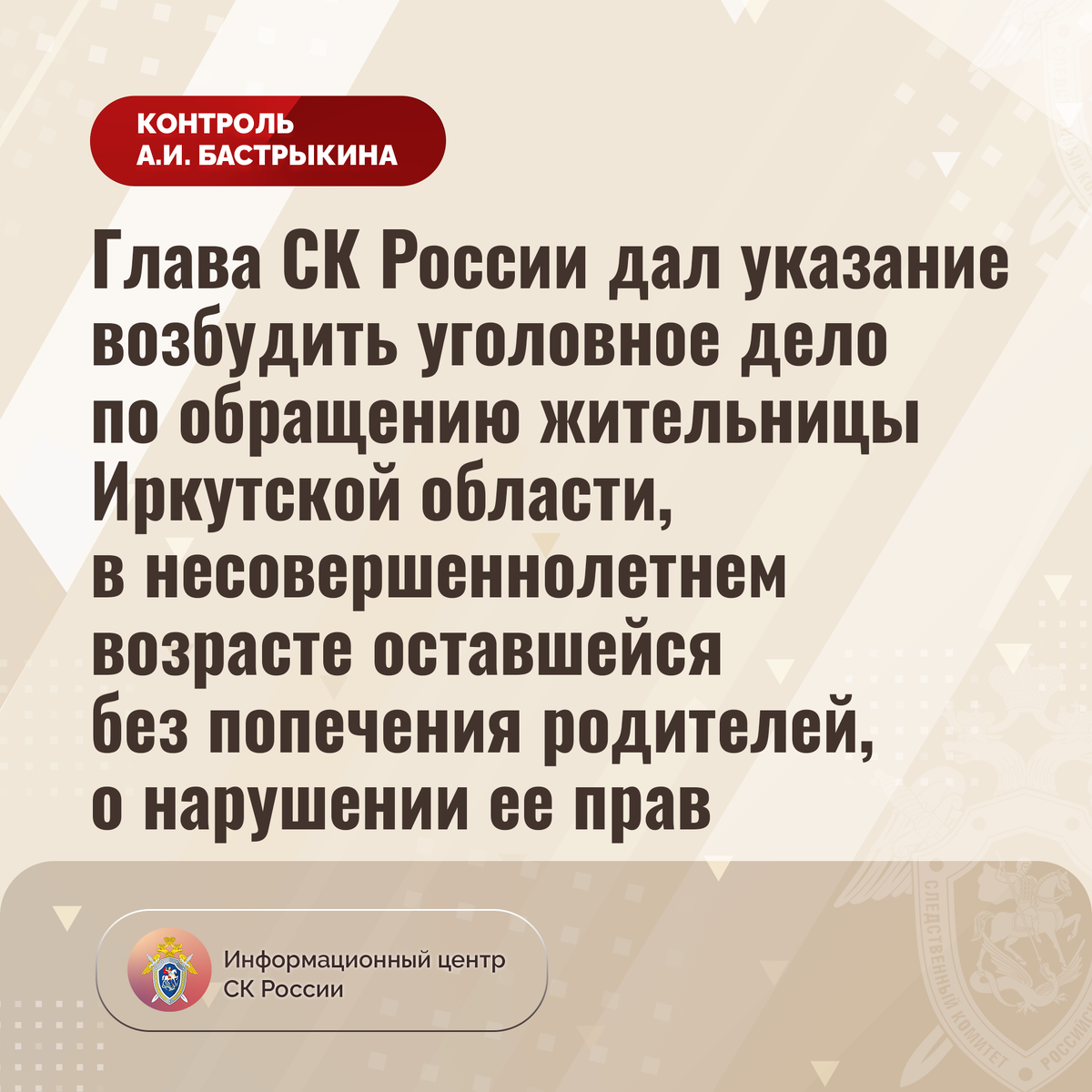 Глава СК России дал указание возбудить уголовное дело по обращению жительницы Иркутской области, в несовершеннолетнем возрасте оставшейся без попечения родителей, о нарушении ее прав В комментариях в аккаунте Информационного центра СК России в социальной сети «ВКонтакте» размещено обращение жительницы Иркутской области, в несовершеннолетнем возрасте оставшаяся без попечения родителей, по вопросу непредоставления ей положенного по закону жилья. Девушка с 2021 года состоит на учете лиц, нуждающихся в обеспечении жилым помещением, однако ее права не реализованы. При этом в 2024 году заявительнице одобрена выдача жилищного сертификата. Вместе с тем денежные средства до настоящего времени ей не перечислены. Многочисленные обращения в профильные структуры результатов не принесли. В СУ СК России по Иркутской области организована процессуальная проверка. Председатель Следственного комитета Российской Федерации Александр Иванович Бастрыкин дал указание и.о. руководителя СУ СК России по Иркутск