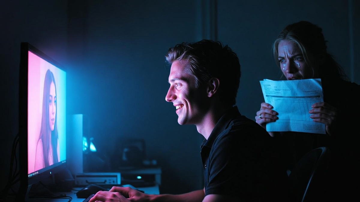 Он выбирает виртуальный образ вместо реальной жены. Тратит семейные деньги на то, чтобы услышать своё имя с экрана.