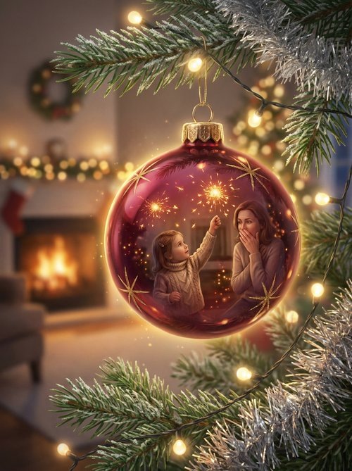 Она узнала его сразу. Не по виду — он стал ярче, новее, красивее. По чему-то другому. По тому, как ёкнуло внутри. По тому, как пол уехал из-под ног. По тому, как вдруг стало пять лет и папа держит тебя за руку в магазинчике, а за окном падает снег, и весь мир — огромный, тёплый, безопасный, и ты выбираешь свой первый ёлочный шарик.