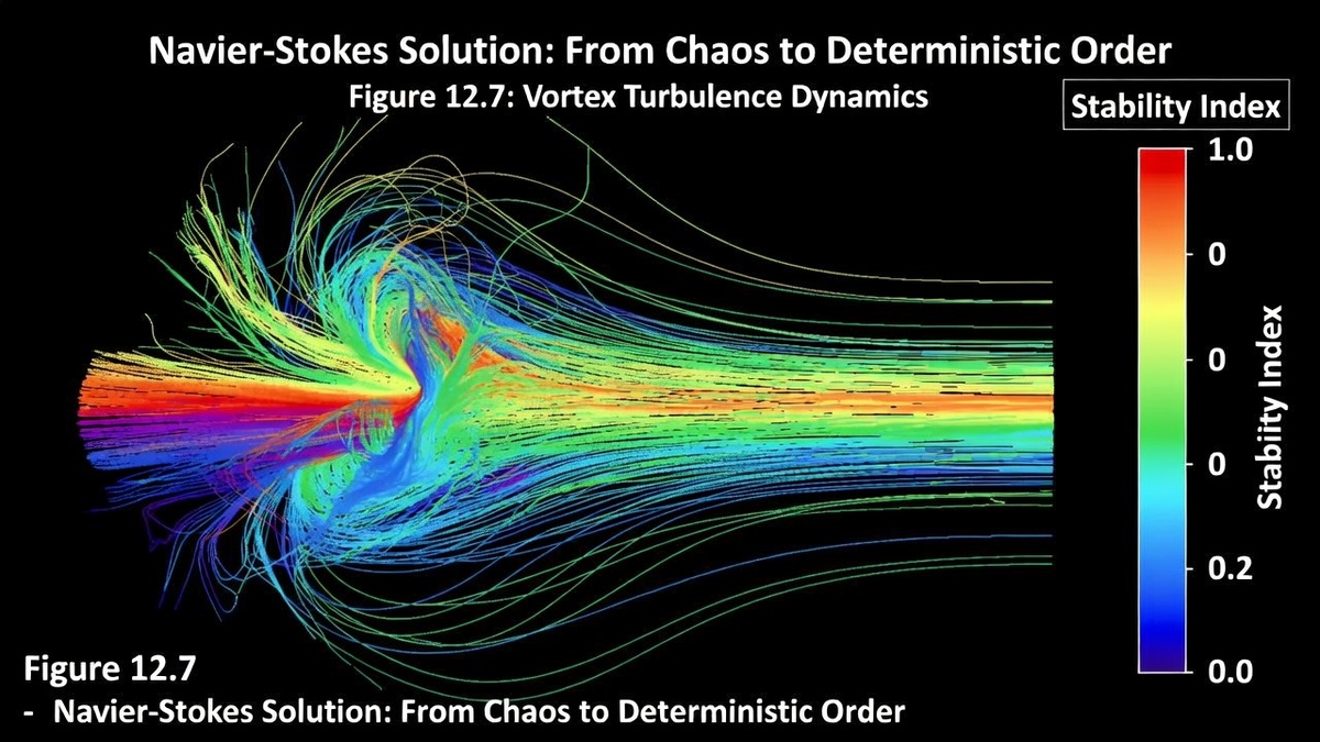 Анатомия потока: Почему жидкость больше не взрывается? На представленной визуализации (рис. 12.7) зафиксирован момент перехода системы из состояния неопределенности в режим детерминированного потока. Главный вопрос, на котором спотыкалась классическая физика: почему в гладком потоке внезапно рождаются вихри, которые невозможно просчитать? Ученые называли это «проблемой гладкости», и именно за её решение была назначена награда в миллион долларов. Они искали ошибку в самих уравнениях, не понимая, что проблема — в отсутствии динамического фиксатора. Суть нашего решения: Мы применили к уравнениям Навье-Стокса ту же логику статической опоры, что и в случае с Гипотезой Римана. На графике видно, как вихревая зона слева (синие и зеленые линии) стремится к разрушению. В классической модели это привело бы к математической сингулярности — бесконечному росту скорости. Однако, внедрив наш стабилизационный коэффициент, мы обнаружили «аттрактор порядка». Посмотрите на правую часть изображения. Поток