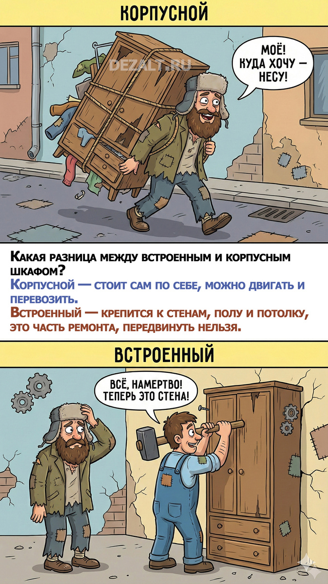 Надоели «успешный успех» и идеально вылизанные интерьеры в ленте? Нас, если честно, они тоже укачали. Мебель — это живой процесс, а не картинка из журнала. Поэтому мы в ДЭЗАЛТ решили похулиганить. Попросили нейросеть нарисовать наши профессиональные советы в виде ироничных комиксов. ⚠️ Внимание: Все персонажи вымышленные, а ситуации доведены до абсурда специально для улыбки! Мы своих клиентов любим и ценим, поэтому советы даем самые настоящие, проверенные годами практики. А вот антураж на картинках — просто, чтобы не было скучно читать. Листайте, смейтесь и мотайте на ус! 👇