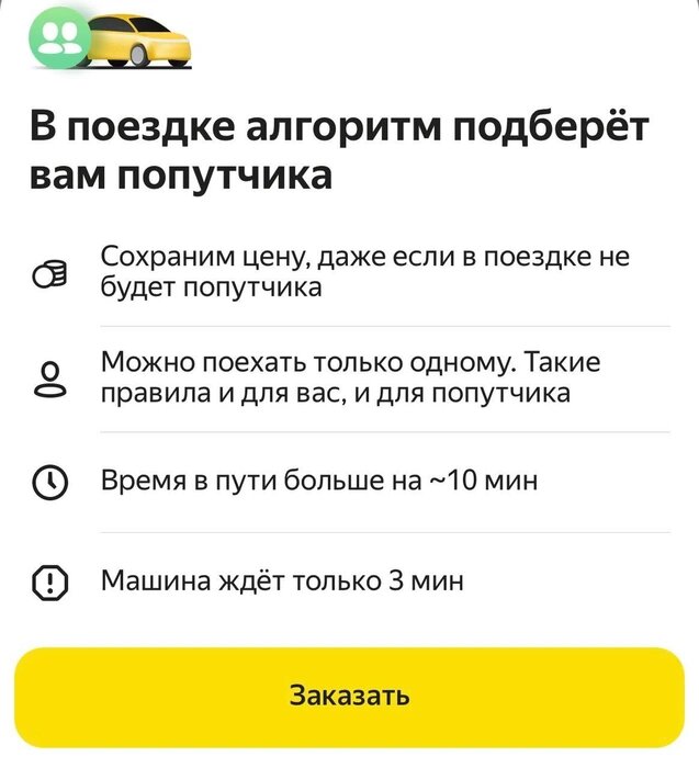 Тариф «Вместе» - запущен в 2022 году, позволяет заказать поездку в такси с попутчиком.