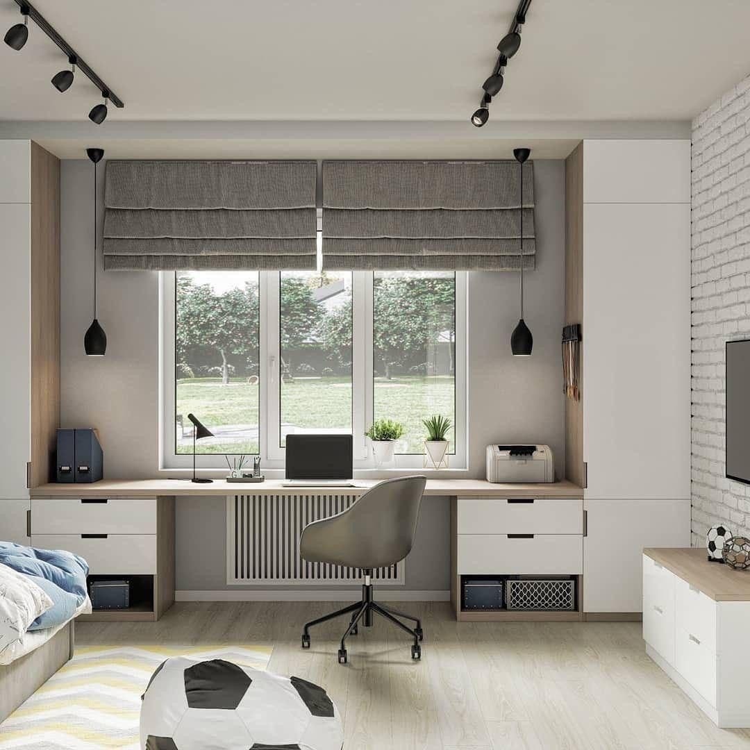 Подоконник -стол, единая столешница от окна, где спокойно поместят оба сына, а главное будет много света в этой рабочей зоне.