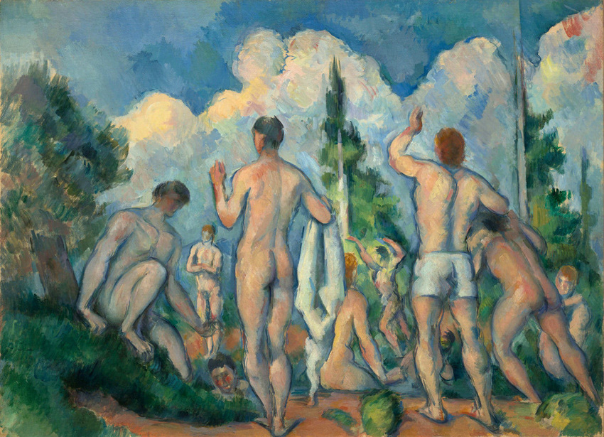 Начиная с 1870-х годов французский художник Поль Сезанн (1839-1906) создал множество картин с изображением купающихся людей. Он мечтал добиться полного слияния фигур с пейзажем. Для него все элементы становились своего рода кирпичиками в построении общей архитектуры картины. Сезанн не акцентировал внимание на телах людей, как это делал, например, Пьер-Огюст Ренуар (1841–1919), он скорее просто структурировал пространство на полотне. Поэтому не удивительно, что тема воды на рассматриваемой картине вообще отошла, по сути, на второй план. А о приверженности Сезанна к импрессионистскому движению можно судить лишь о переливах облаков. [Он] двигался к абстракции природных тел, потому что видел в них только поверхности и живописные объёмы , — замечал Малевич. Вдохновением для этой картины явно служил художник эпохи Ренессанса - Лука Синьорелли (1450—1523). А монументальность композиция, которая берёт за образец работы Никола Пуссена (1594-1665), свидетельствуют о сильном желании художника