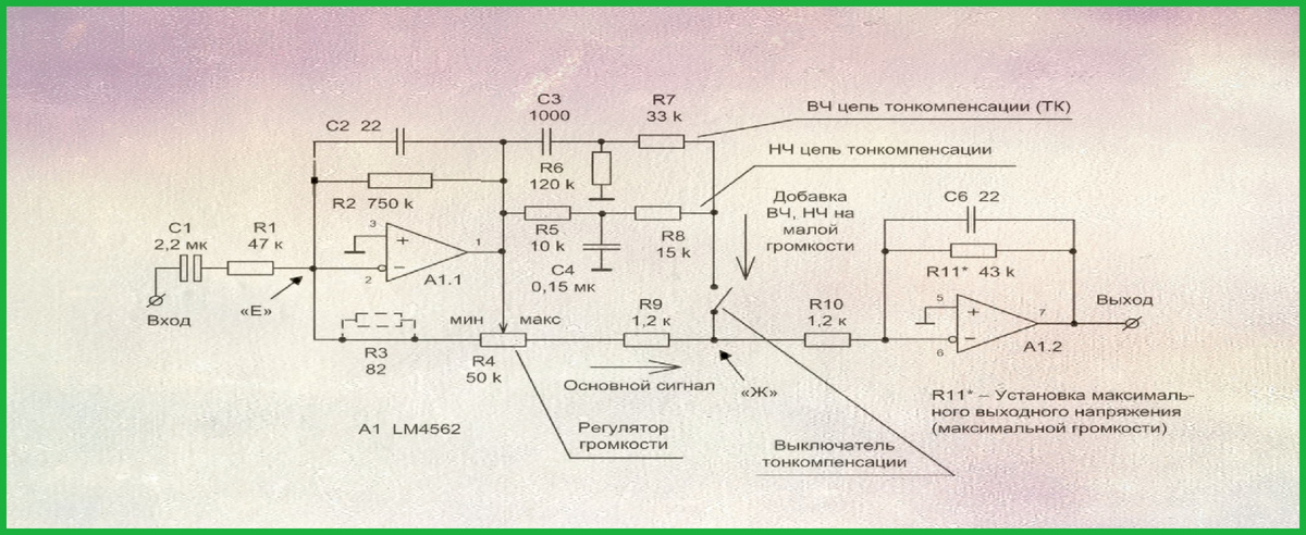 - Регулятор громкости на ОУ А1.1 - отвечает за изменение уровня сигнала и одновременную добавку ВЧ и НЧ составляющих при уменьшении громкости.