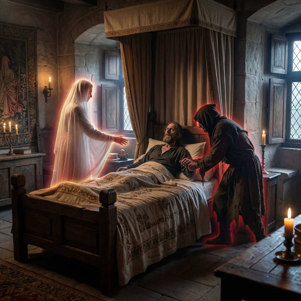 Сюжет драмы разворачивался прямо у постели умирающего. Это не просто лежание под одеялом, это боксерский ринг. В левом углу — Демоны, в правом — Ангелы. А приз — ваша вечная душа.