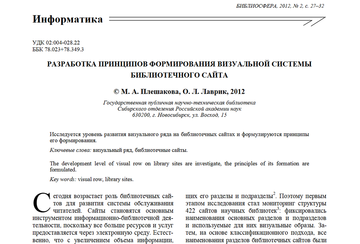 Плешакова М. А., Лаврик О. Л. Разработка принципов формирования визуальной системы библиотечного сайта