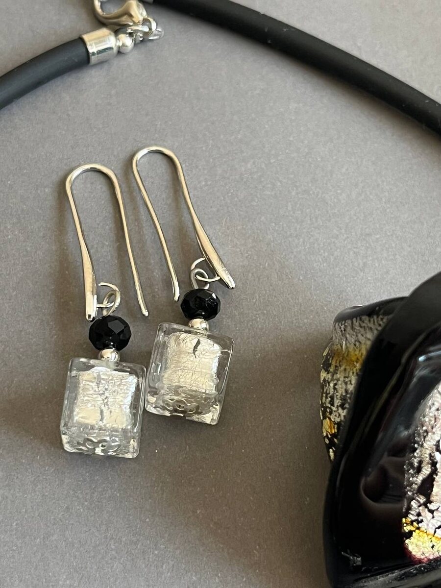 🤍🖤 — чёрный цвет создаёт элегантный и стильный образ в сочетании с серебром, подчёркивает роскошь и изысканность серебряных предметов. Набор CUBETTA с бусинами из муранского стекла Длина:45 см+5 см удлиняющая цепочка⛓️💥 Кольцо лист с серебром из муранского стекла На фото 18,5 размер #муранскоестекло