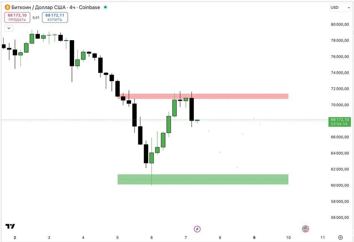 🟢 Нам не удалось закрепиться выше ключевого сопротивления, что указывает на повторный откат цены и начало более затяжной проторговкой в текущем боковом канале на уровне $69 - 62к. Поэтому, будем сейчас ждать определеного боковика, после которого должны увидеть очередное тестирование данного сопротивления и уже желательно с осуществлением закрепа выше. #Bitcoin #BTC #Анализ #альтсезон BusineesEconomyBlockchain l Bybit