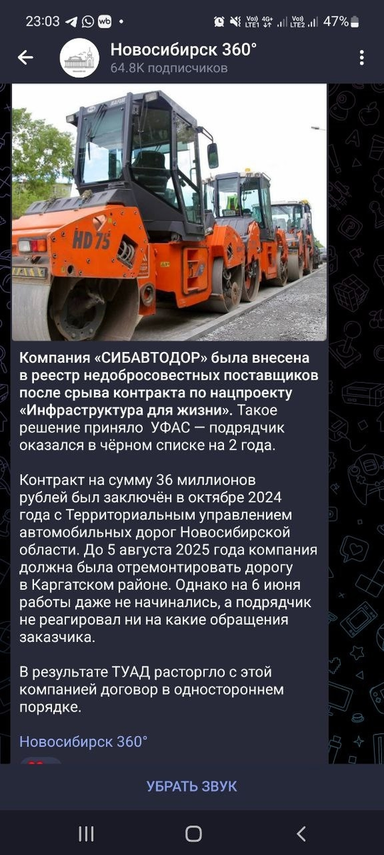 Сибавтодор - компания которая проводила ремонт дорог в каргатском районе. Контракт на сумму 36 миллионов рублей был заключён в октябре 2024 года с Территориальным управлением автомобильных дорог Новосибирской области. До 5 августа 2025 года компания должна была отремонтировать дорогу в Каргатском районе. Однако на 6 июня работы даже не начинались, а подрядчик не реагировал ни на какие обращения заказчика.