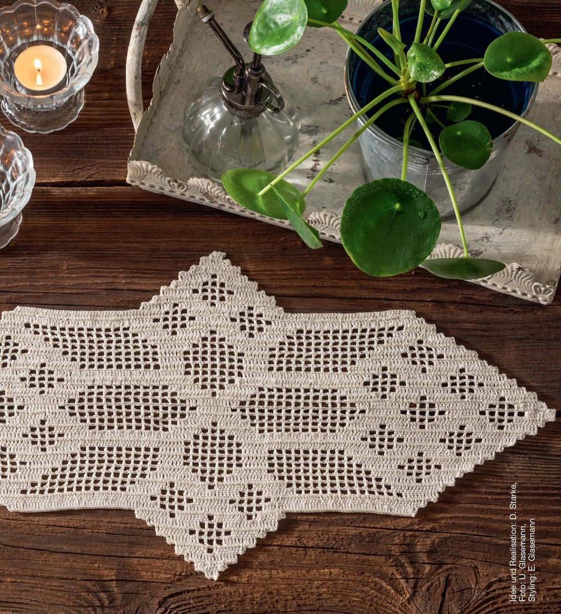 Салфетки эти смотрятся довольно необычно. Можно, конечно, поскольку филейная техника подразумевает наличие сетки в рисунке, благодаря этой сетке выровнять рисунок и сделать стандартный классический вариант, например, прямоугольной салфетки или квадратной, но тот вариант, который дан здесь, я считаю, имеет место быть.