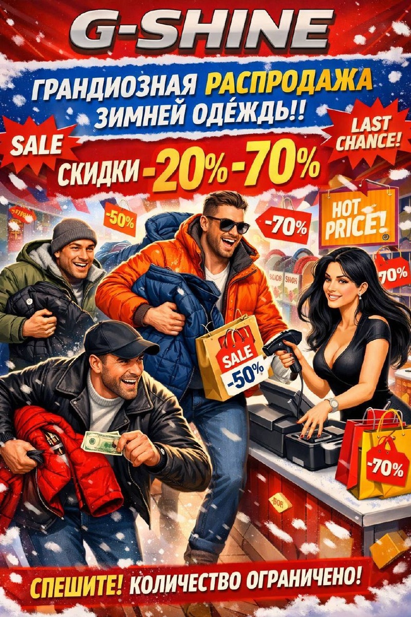 🔥 Куртки в панике. Мужики на старте. Касса дымится. ❄️ СКИДКИ ОТ –20% ДО –70% ❄️ Да-да, это не сон и не ошибка кассира. 🧥 Хватай куртку, 🏃♂️ беги к кассе, 💳 плати, пока сосед не утащил твой размер! ⚠️ КОЛИЧЕСТВО ОГРАНИЧЕНО Кто успел — тот утеплился. Кто не успел — мёрзнет стильно, но зря. 💥 Зима длинная. 💥 Скидки короткие. 💥 Решение очевидно. 👉 G-SHINE Тут греют не только куртки, но и цены 😎