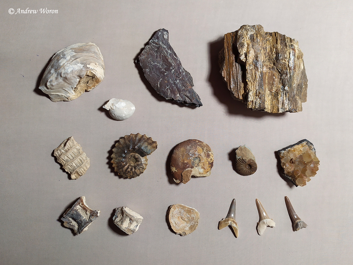Давно уже не выкладывал ничего на свой Канал «Иду за солнцем…», а виною тому наша донская погода – то снег с морозом до -20, то оттепель с дождем. Вот и сейчас за окном белым-бело, а на градуснике +1,5 по Цельсию и брызгает дождик. Невозможно никуда пойти или поехать. Поэтому продолжаю сидеть дома и заниматься упорядочиванием экспонатов своей коллекции, а также принимать в гостях друзей-коллекционеров. А на днях пообщался с коллегами из казахстанского городка Актау и приобрел у них кое-что новенькое. Вот об этом и хочу рассказать в данной публикации. Начну с того, что меня заинтересовали зубы тамошних ископаемых акул, в изобилии встречающиеся в районе Мангышлак. Но акулы Отодусы, что оставили там свои зубы, пока мне не по карману, так что нацелился на другие, и вдобавок на всякую приятную мелочь. Ну а теперь по порядку. Собранную посылку мне отправили СДЭКом, и всего через 10 дней я получил её. Общее фото пятнадцати предметов, которые буквально вчера пополнили мою коллекцию. За них бол