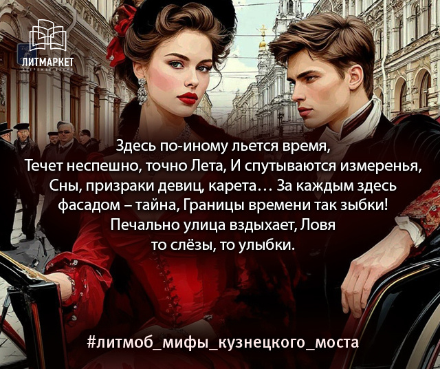 Здесь по-иному льется время, Течет неспешно, точно Лета, И спутываются измеренья, Сны, призраки девиц, карета… За каждым здесь фасадом – тайна, Границы времени так зыбки! Печально улица вздыхает, Ловя то слёзы, то улыбки. Подробнее по ссылке: https://litmarket.ru/selections/mify-kuzneckogo-mosta