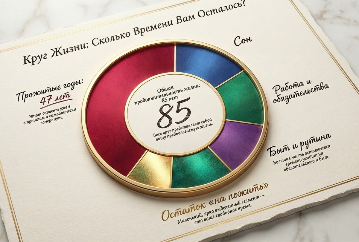 Твой мозг - хитрый мудак. Он все время шепчет: «У тебя еще куча времени». Он считает годами, а не тем, сколько жизни в этих годах реально остается. Я сделала простое упражнение. Без эзотерики. С калькулятором. ✍️Вводные данные: Я собираюсь прожить минимум 85 лет. Сейчас мне 47. 👉 Половина круга уже закрашена. Без эмоций. Просто факт. Что еще уйдет, если считать честно Сон Даже по 7 часов - это еще примерно 13 лет жизни. Меня там нет. Я сплю. Работа, дорога, обязательства В среднем - 10-12 лет. Быт и обслуживание реальности Еще 6–7 лет. И вот тут стоп Из оставшихся 38 лет после всех вычитаний остается… 🟥 около 6–8 лет на “пожить”. Не когда-нибудь. А прямо сейчас. Где здесь тело и здоровье Скажу прямо. Без розовых соплей. ☝️тело не живет в будущем ☝️гормоны не ждут удобного момента ☝️обмен веществ не читает твои планы Ты можешь сколько угодно откладывать себя на «потом», но тело вписывает это в счет. А потом приносит его в виде: ☝️аптек ☝️больниц ☝️диагнозов и вопроса: