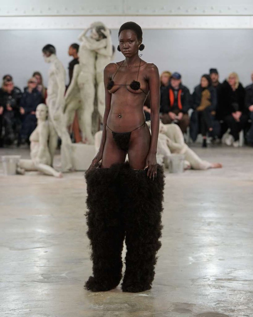 И речь не только о знаменитом платье Марго Робби: тенденция выходит далеко за рамки единичного хита. На недавней Неделе высокой моды в Париже коллекция Charlie Le Mindu наглядно продемонстрировала, как можно художественно работать с этим приёмом. Дизайнер смело вплёл волосы в конструкции нарядов, превратив их в выразительный элемент кутюрного высказывания. А если говорить о более провокационных проявлениях тренда — нельзя обойти вниманием нашумевшие «мохнатые трусы» от Ким Кардашьян. Этот смелый эксперимент, пусть и вызвавший споры, закрепил тему волос в моде как полноправный объект дизайнерской рефлексии.