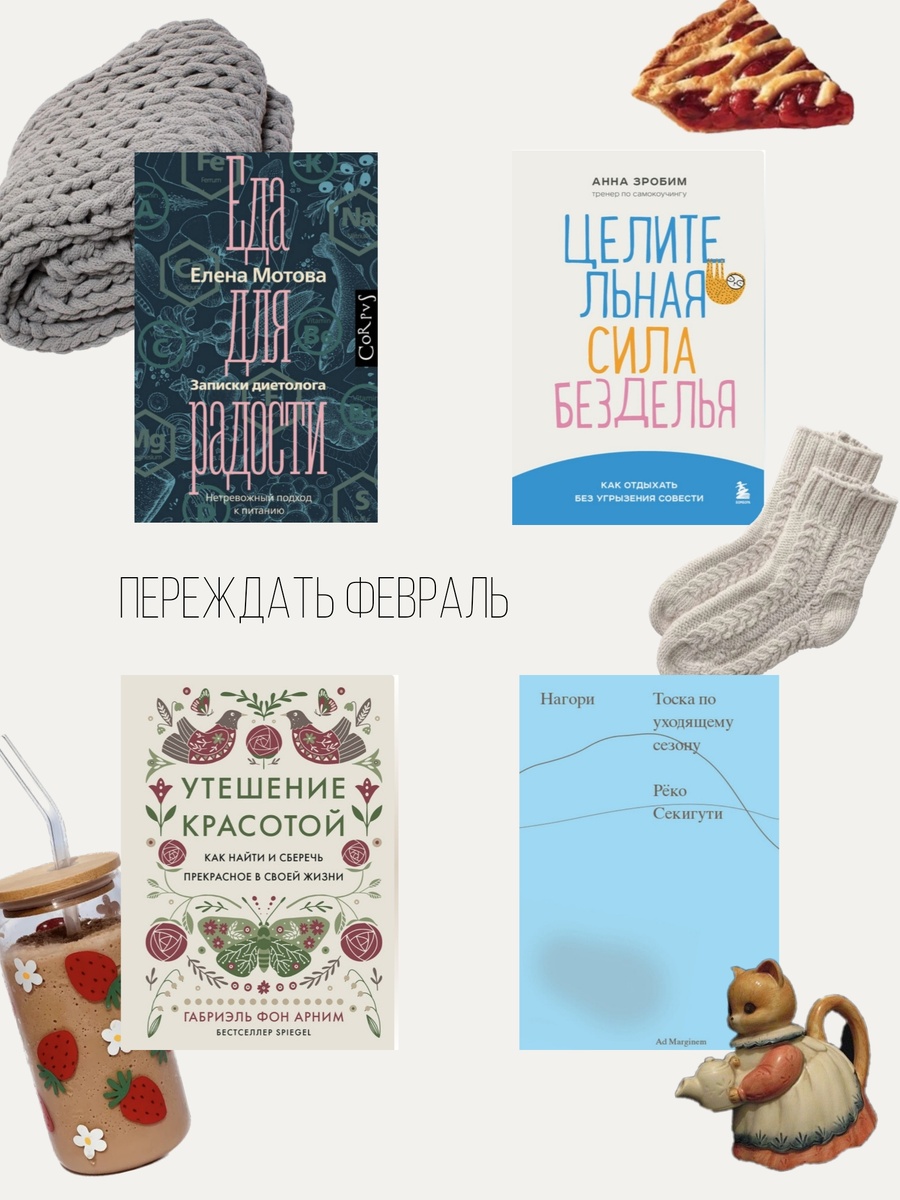 ). В это время обычно не до великих свершений. Скорее хочется отстать от себя, притормозить, остаться дома и как следует зауютиться☕️ Для этого собрала для вас подборку поддерживающей, тёплой, антидепрессивной литературы. Без «стань лучшей версией себя», без мотивационных пинков и успешного успеха. 1. «Еда для радости. Записки диетолога. Нетревожный подход к питанию» - Елена Мотова Отличная книга для тех, кто хочет узнать что-то новенькое. Здесь про питание спокойно и по-человечески: что говорят исследования, что на самом деле с диетами, витаминами и продуктами. Без страшилок, без морализаторства. Одна из самых полезных фишек - как разнообразить свой рацион (актуалочка в зимний период😌). 2. «Целительная сила безделья. Как отдыхать без угрызений совести» - Анна Зробим Про то, как наконец научиться ничего не делать и не чувствовать себя при этом плохим человеком. Книга помогает немного перенастроить голову и ослабить внутреннего надзирателя. Здесь буквально учат отдыхать, но не «прод