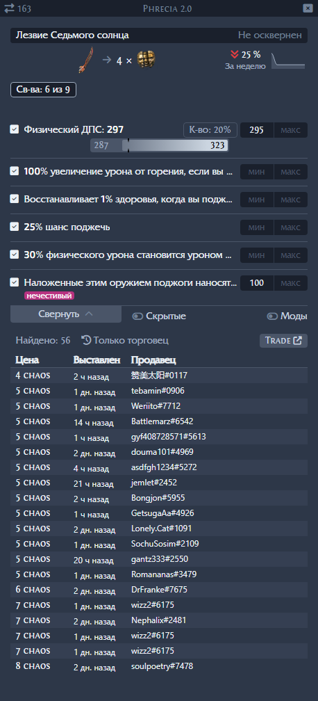- Свойства и роллы: Здесь отображаются все модификаторы предмета. Вы можете задать минимальное и максимальное значение для каждого ролла, чтобы найти точные аналоги вашего предмета. Это основа точной оценки дорогих вещей.