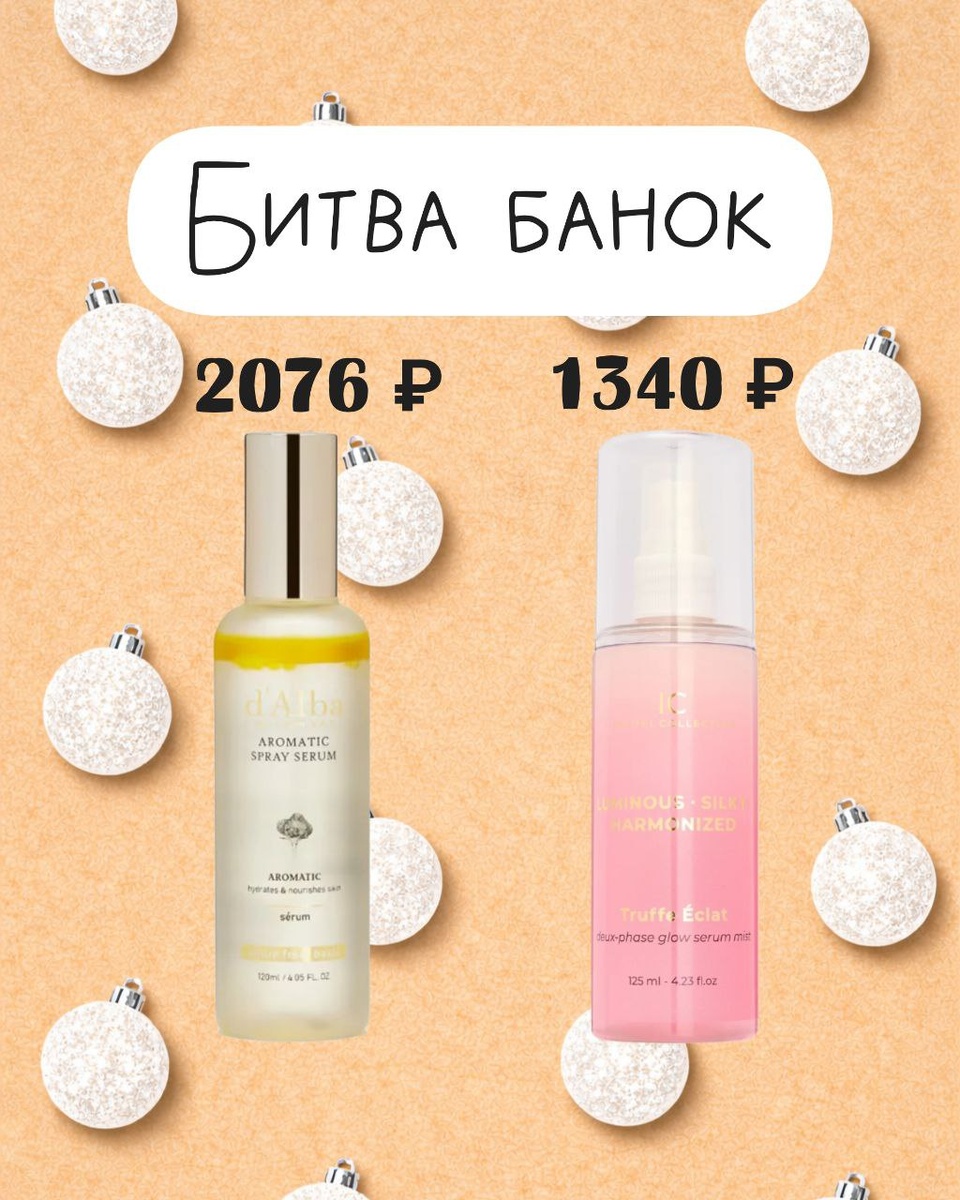 Умылась, напшикала на себя и пошла жить жизнь. Именно поэтому я так подсела на спрей-сыворотки. Минимум усилий, максимум пользы Сегодня устраиваю, вашу любимую, битва банок #нашелучше В одном углу ринга двухфазная спрей-сыворотка Invit 1. Плотная, барьерная база: сквалан, эмоленты, силикон. Кожа моментально становится гладкой и защищённой 2. Но решает не это, а ретинол (Retinyl Acetate). Да, мягкая форма, но это всё равно ретиноид: обновление кожи, работа с морщинами, упругостью и фотостарением. 3. Плюс ниацинамид, антиоксиданты (витамины С и Е), трюфель, коллаген и эластин, ферменты, успокаивающие компоненты. По сути не просто водичка, а anti-age уход Во втором углу ринга: D’Alba Truffle Spray Serum. Красивый, золотой, всем известный флакон и очень распиаренный 1. Здесь ставка на комфорт: цветочная вода, гиалуронка, мочевина, масла, пантенол, центелла, пробиотики, ниацинамид. Кожа становится увлажнённой, напитанной, ухоженной: да 2. Но давайте честно: несмотря на все громкие слова