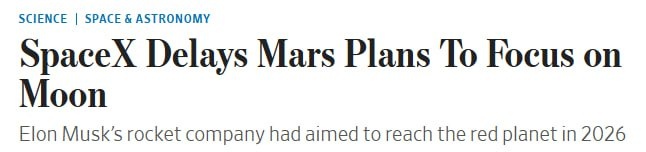 Компания SpaceX перенесла запланированную на 2026 год миссию на Марс, сместив приоритет в пользу лунной программы, поддерживаемой NASA. Теперь цель компании — осуществить беспилотную посадку на Луну в марте 2027 года. Ранее SpaceX рассчитывала отправить несколько кораблей Starship к Марсу в конце 2026 года, однако теперь заявляет, что марсианское направление будет реализовано позже, после выполнения ключевых лунных этапов. Источник — The Wall Street Journal. #SpaceX #Марс #Луна #NASA #Космос #КосмическиеПрограммы ✈️ Будь с нами - поделись с друзьями: Хвитторная