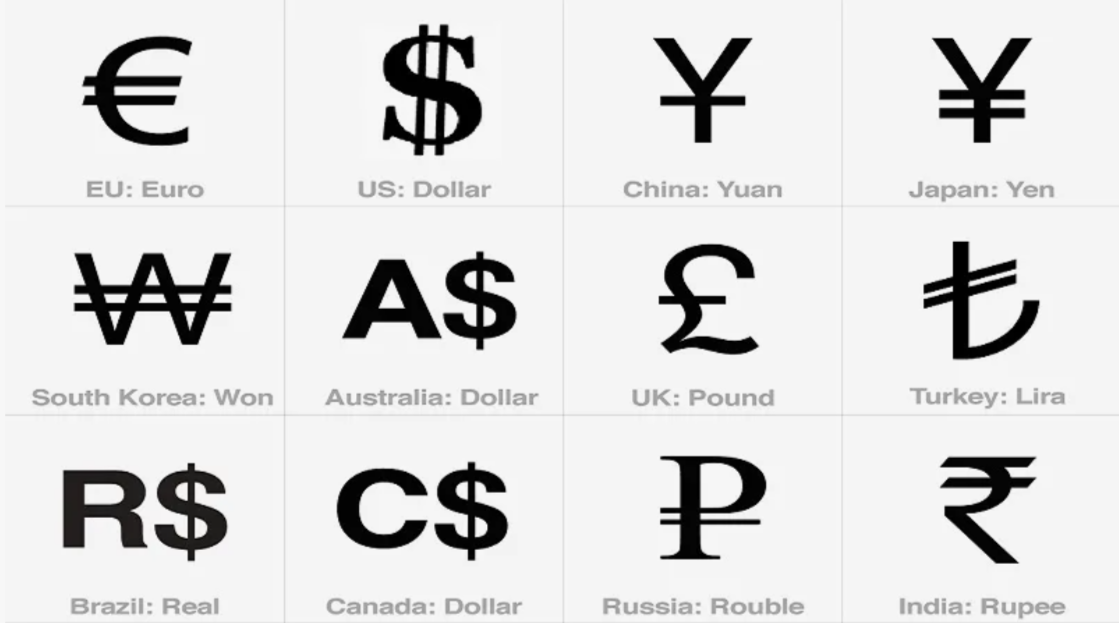 Согласно общемировому стандарту Unicode, на сегодняшний день уникальные графические символы имеют около 30 мировых валют. Всего в мире насчитывается порядка 180 валют, однако большинство из них не обладает собственным специальным знаком. ₽ - Знак русского рубля ₫ - Вьетнамский донг ₹ - Индийская рупия знак ₾ - Грузинский лари $- знак доллара ¢ - нак цента, используется в разных странах для обозначения одного цента или сотой части доллара € - знак евро £ - знак фунта стерлингов ¥ - Японская иена или китайский юань ₩ - Корейский вон знак ₸ - символ обозначает казахстанский тенге ֏ - Армянский драм ¤ - общий символ валюты ₱ - Знак филиппинского песо R$ - официальный символ бразильского реала ₦ - Символ валюты нигерийская найра ƒ - Знак флорина - это символ, который используется для валют, называемых флорином, также называемыми гульденами ₮ - Тугрик является официальной валютой Монголии ৲ - бенгальская рупия ৳ - бангладешская така ₺ - символ турецкой лиры ₨ - Символ валюты рупия, которая и
