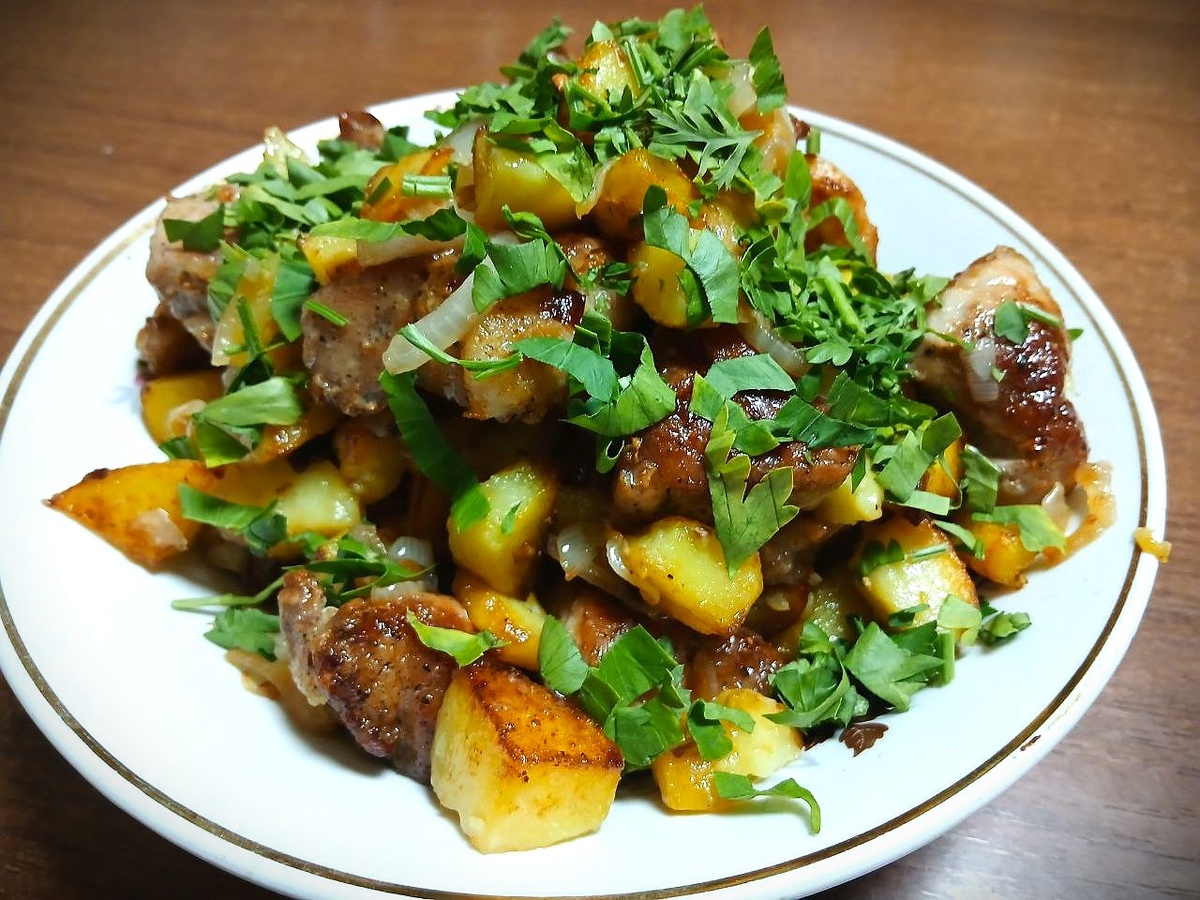 Сегодня делюсь с вами рецептом одного из самых вкусных блюд из свинины, которым я часто балую свою семью. Свинина с крупно нарезанным луком, обжаренная до румяной корочки, и нежнейший картофель, пропитанный ароматами чеснока, кориандра и свежей петрушки — настоящее объедение! Готовила без лишнего масла, чтобы сохранить яркий мясной вкус и хрустящий лук. Это блюдо просто приготовить, оно сытное и очень душевное. Попробуйте — не пожалеете! Ингредиенты: ⦁ Свинина (шея) — 700 г ⦁ Лук (2 крупные луковицы) — 400 г ⦁ Картофель — около 1 кг ⦁ Сливочное масло — 100 г ⦁ Растительное масло — для обжарки лука ⦁ Чеснок — 2 зубчика ⦁ Молотый черный перец — по вкусу ⦁ Соль — по вкусу ⦁ Молотый кориандр — по вкусу ⦁ Петрушка (свежая) — для подачи Приготовление: 1. Свинину нарежьте кусками среднего размера. 2. В сухой разогретой сковороде обжарьте куски мяса без масла до красивой румяной корочки с обеих сторон. 3. Достаньте мясо из сковороды и отложите. 4. В эту же сковороду добавьте немного растительн
